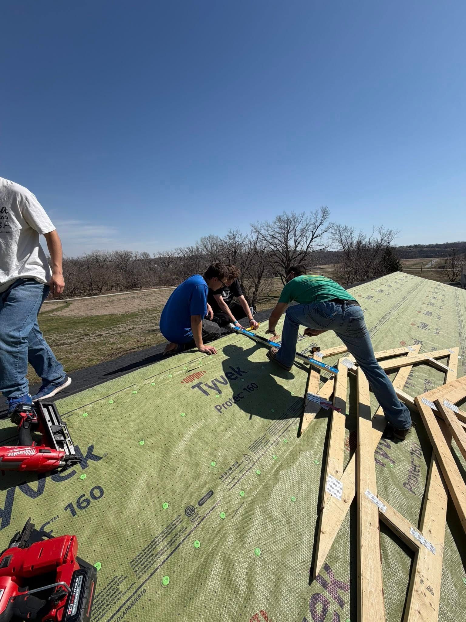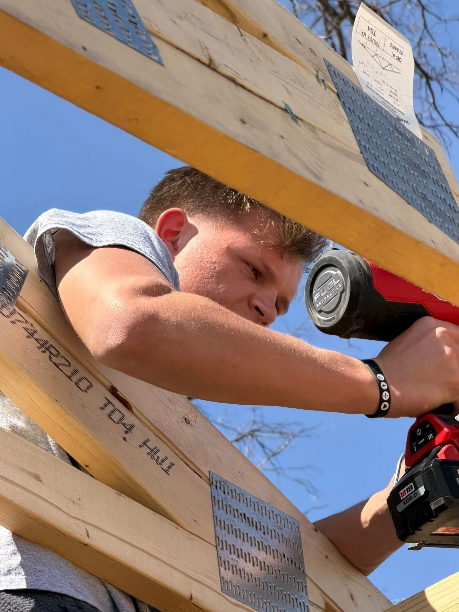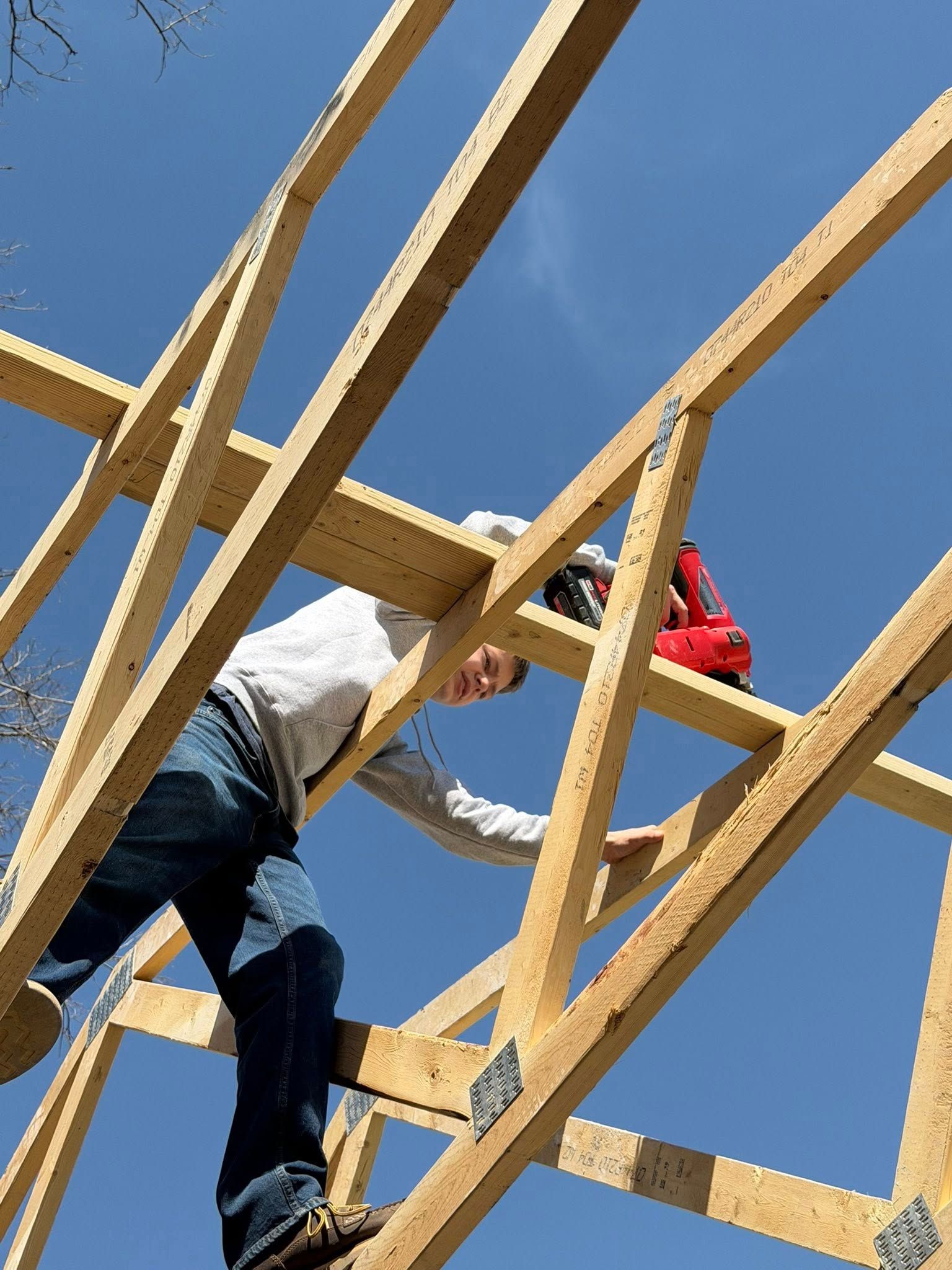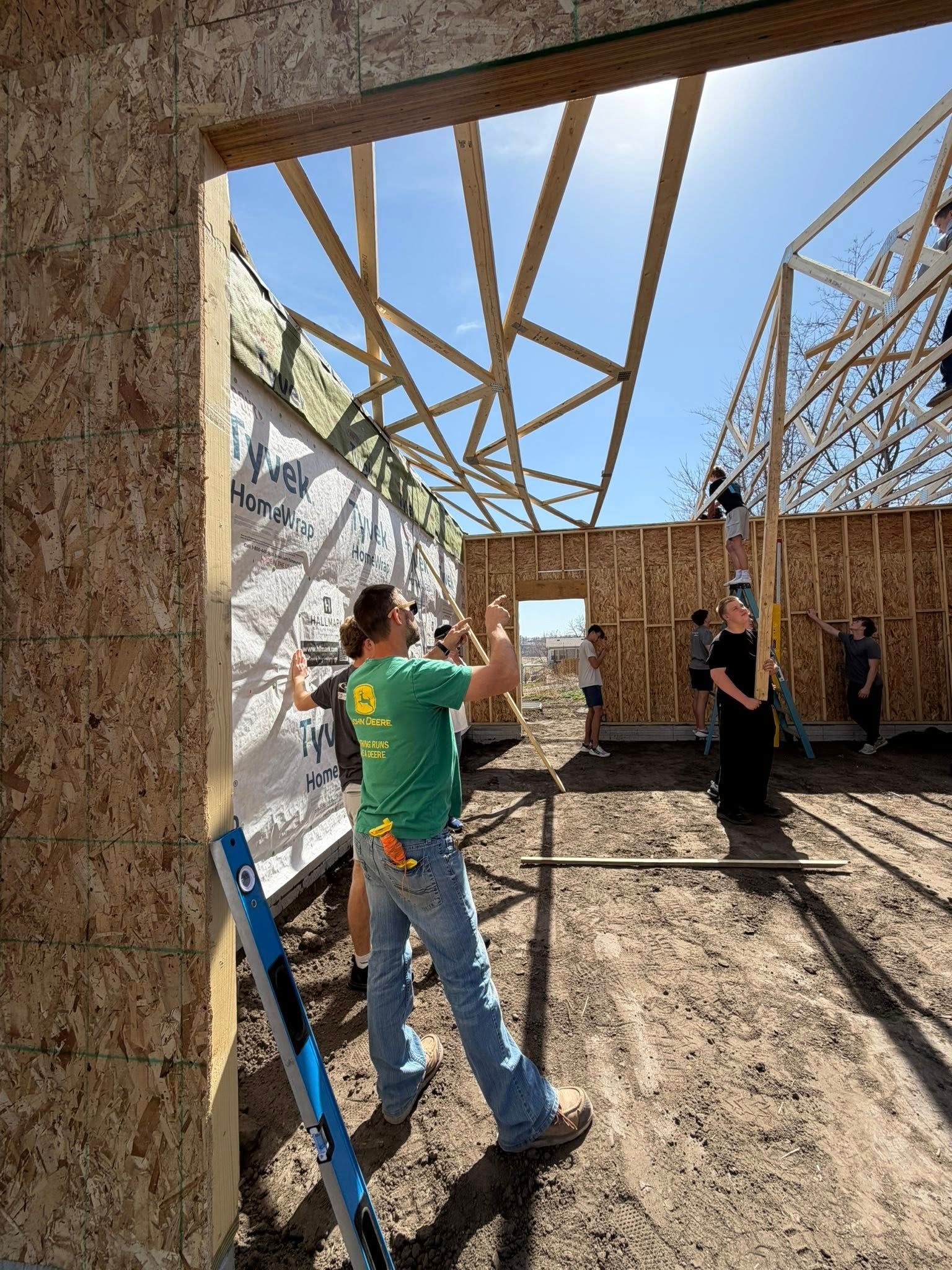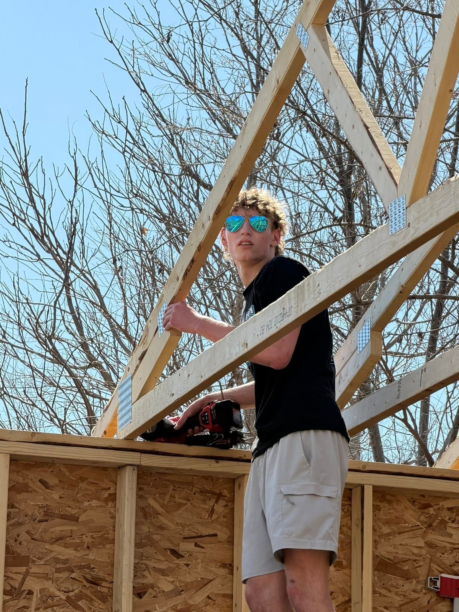 Dustin Foutch's Ashland "Builders of the Future" construction class takes advantage of the favorable weather to set the trusses and prepare for the roof sheathing next. Great job.