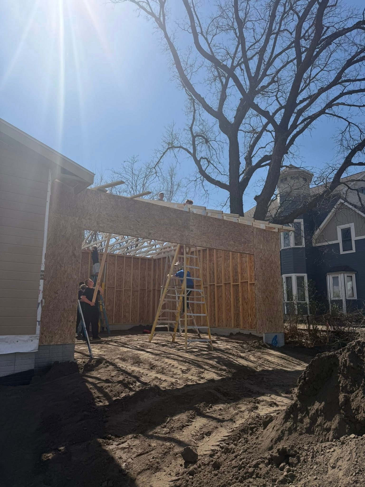 The Ashland “Builders of the Future”construction class, successfully relocated their house from campus to its permanent site last week. This week, they have already begun framing their attached garage, erected the walls, and are currently working on the trusses. Great job.